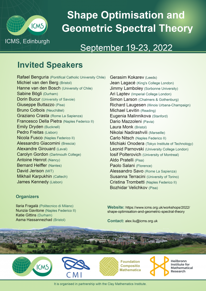 The workshop aimed to bring together both senior leading figures and emerging experts in the fields of shape optimisation, spectral inequalities, Robin and Steklov eigenvalue problems, properties of eigenfunctions and solutions to PDEs.
